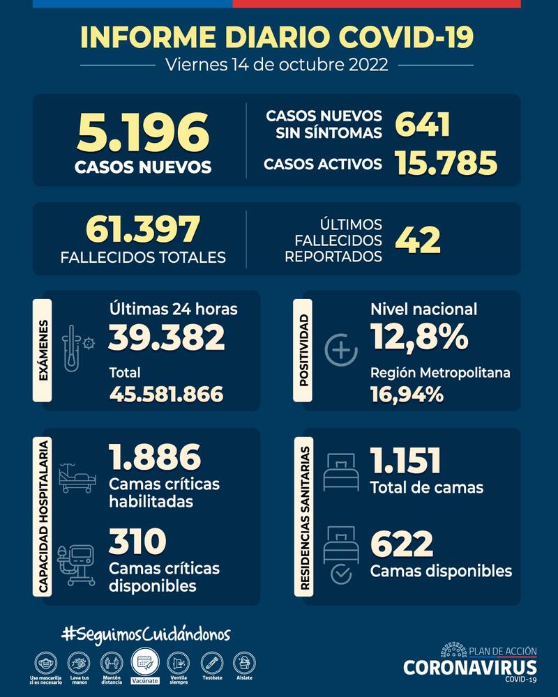 La mañana de este viernes 14 de octubre el Ministerio de Salud (Minsal) reportó 5.196 casos nuevos de Covid-19, de los cuales 3.036 corresponden a personas sintomáticas y 641 no presentan síntomas. Además, se registraron 1.519 test PCR Positivo que no fueron notificados.