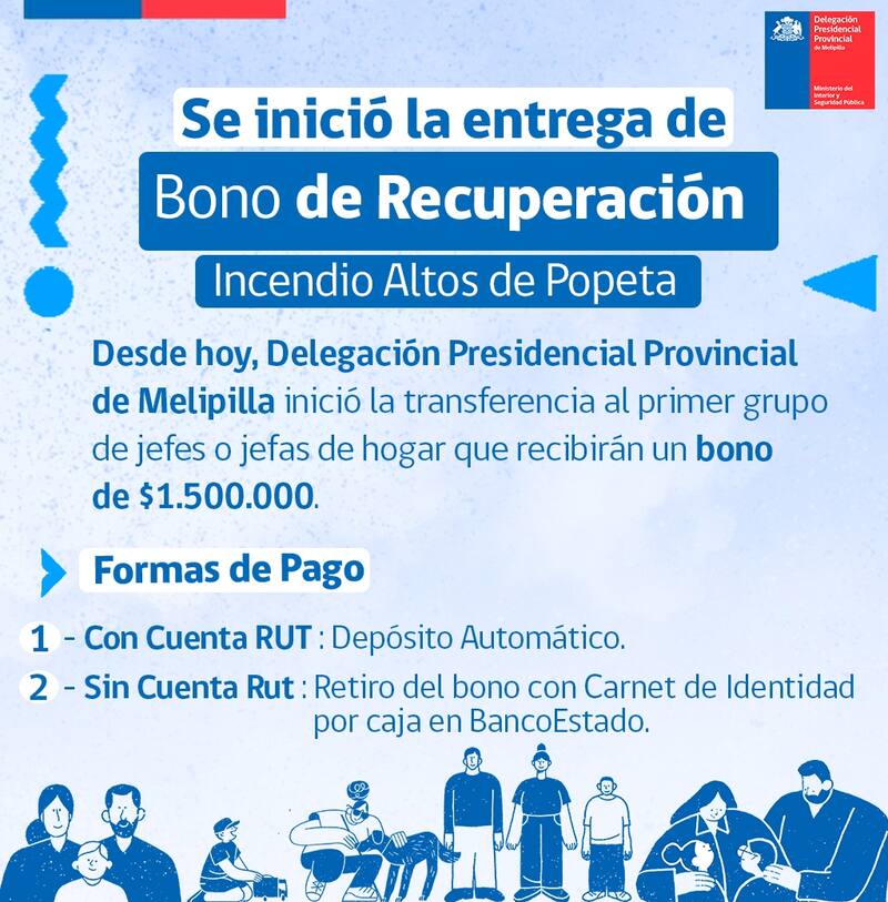 Dentro de los primeros beneficiados, esta semana la delegada presidencial provincial de Melipilla, Sandra Saavedra, anunció el inicio de la entrega del aporte para el primer grupo de familias afectadas por el incendio de Altos de Popeta.