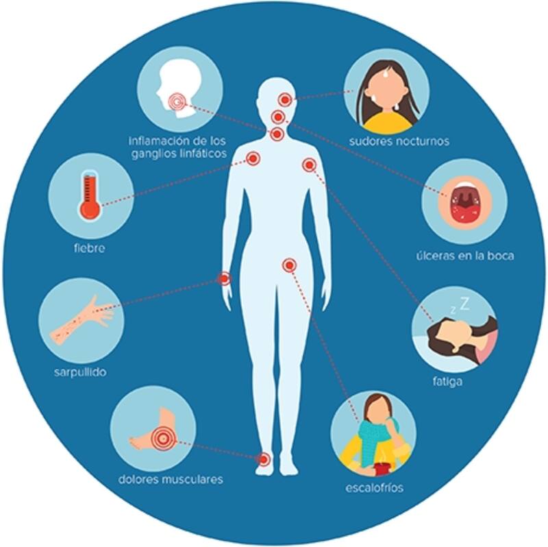 Sus síntomas difieren según la etapa en la que se trate. En ocasiones, durante las primeras semanas tras el contagio la persona no manifiesta ningún síntoma, mientras en otras, se presenta como un "cuadro seudogripal con fiebre, cefalea, erupciones o dolor de garganta".