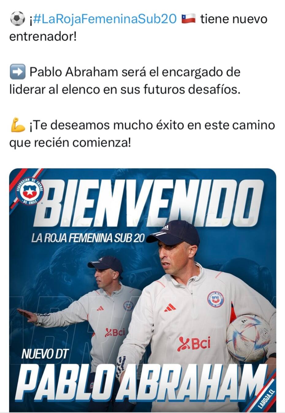 En una publicación en las redes sociales, desde Quilín anunciaron la llegada del entrenador, con el mensaje “La Roja Femenina Sub 20 tiene nuevo DT. Pablo Abraham será el encargado de liderar al elenco en sus futuros desafíos. ¡Te deseamos mucho éxito en este camino que recién comienza!”.