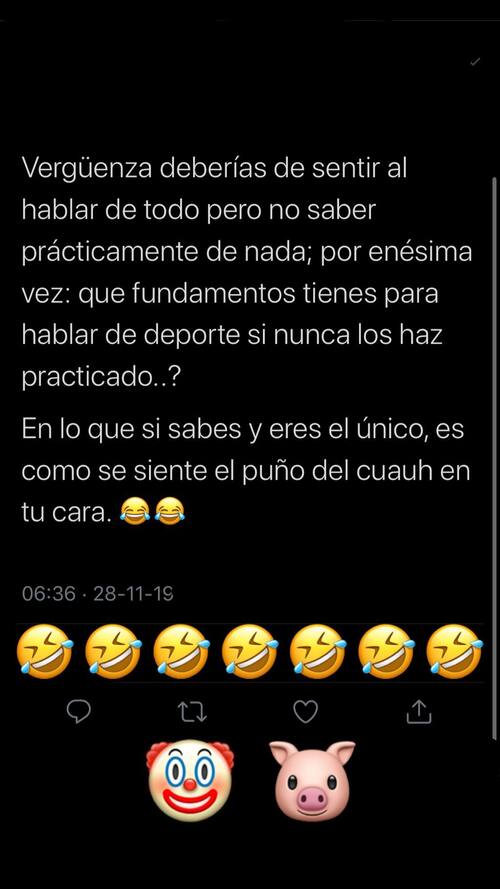 Además, el formado en Universidad Católica afirmó sus palabras apuntando con nombre y apellido para quién iba este mensaje. "David Faitelson es para ti! Ya que no tengo Twitter te lo mando por aquí... Eres un cagón", expresó.
