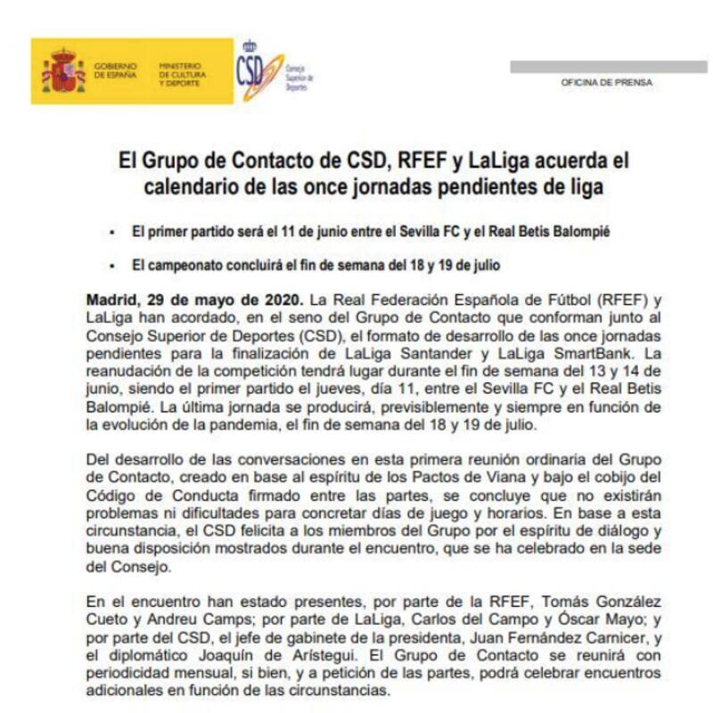 El Gobierno de España, a través de el Consejo Superior de Deportes, anunció a través de un comunicado que el torneo hispano se reiniciará el 11 de junio, con el Clásico entre Sevilla y Real Betis.