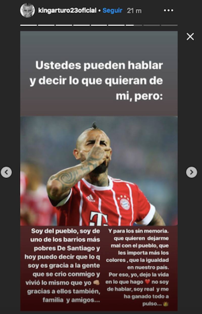 "Ustedes pueden hablar y decir lo que quieran de mí, pero soy del pueblo, soy de uno de los barrios más pobres de Santiago y hoy puedo decir que lo que soy es gracias a la gente que se crió conmigo y vivió lo mismo que yo", escribió Vidal en una historia de Instagram.