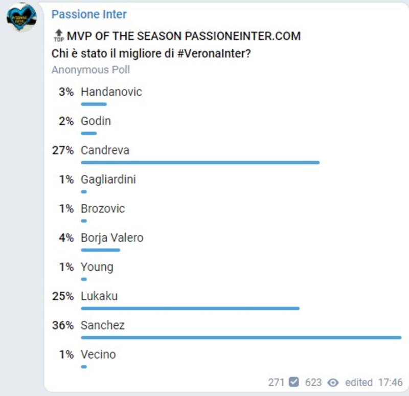 y que se hace cada semana, se elige al MVP del encuentro de la fecha, y el ‘Niño Maravilla’ fue uno de los que arrasó en ésta, obteniendo un 36% de los votos. En segundo lugar, los hinchas pusieron a Candreva (27%), seguido muy de cerca por Romelu Lukau (25%), siendo los mejores evaluados en un duelo done el equipo quedó bastante en deuda, mostrando deficiencias en la parte defensiva. A pesar de ello Alexis Sánchez está lejos de liderar la tabla general de la temporada, donde quien es elegido MVP acumula 5 puntos, mientras que el segundo lugar obtiene 3, y el tercero solo una unidad. Esta tabla general la lidera sin discusión Romelu Lukaku, con 65 unidades seguido de forma casi lejana por Lautaro Martíenez con 48 y Nicolo Barella con 43. El chileno ocupa el noveno puesto con 19 puntos.