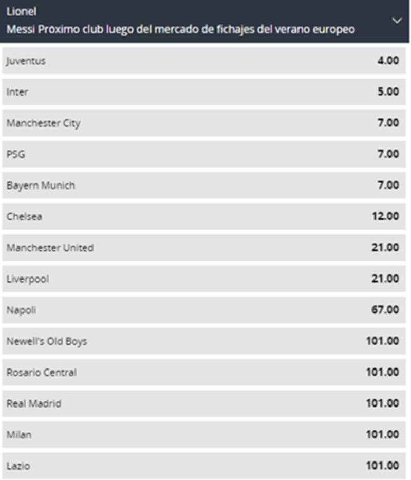 , establece una serie de posibles clubes a los que podría llegar “La Pulga”. El favoritismo se lo lleva la Juventus, donde podría compartir con Cristiano Ronaldo. Esta chance paga 4.00. Luego, vienen Inter de Milán (5.00), Manchester City, PSG y Bayern Münich (7:00).