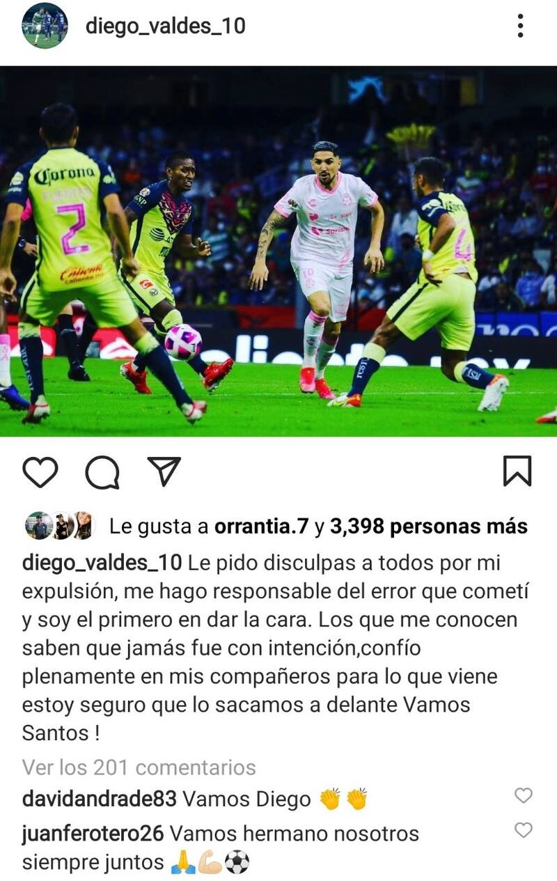 "Le pido disculpas a todos por mi expulsión, me hago responsable del error que cometió y soy el primero en dar la cara. los que me conocen saben que jamás fue con intención, confío plenamente en mis compañeros para lo que viene. Estoy seguro que lo sacamos adelante. Vamos Santos!", señaló el volante ofensivo en su cuenta de Instagram.