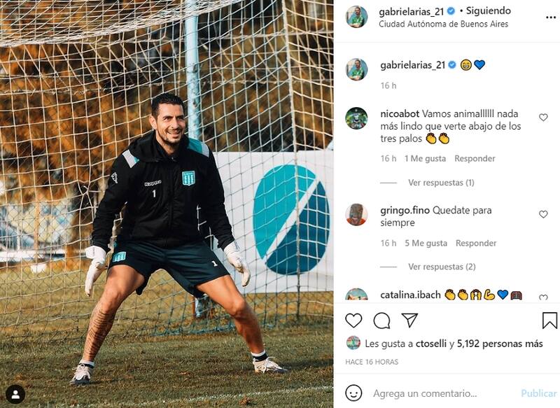 Gabriel Arias ya entrena con normalidad tras recuperarse del COVID-19. El meta argentino-chileno fue diagnosticado el pasado 15 de marzo y se mantuvo en aislamiento 10 días. Hoy sumará una nueva jornada de entrenamiento de cara al próximo compromiso de su club, Racing, quien enfrentará al River Plate de Paulo Díaz, donde asoma como titular.
