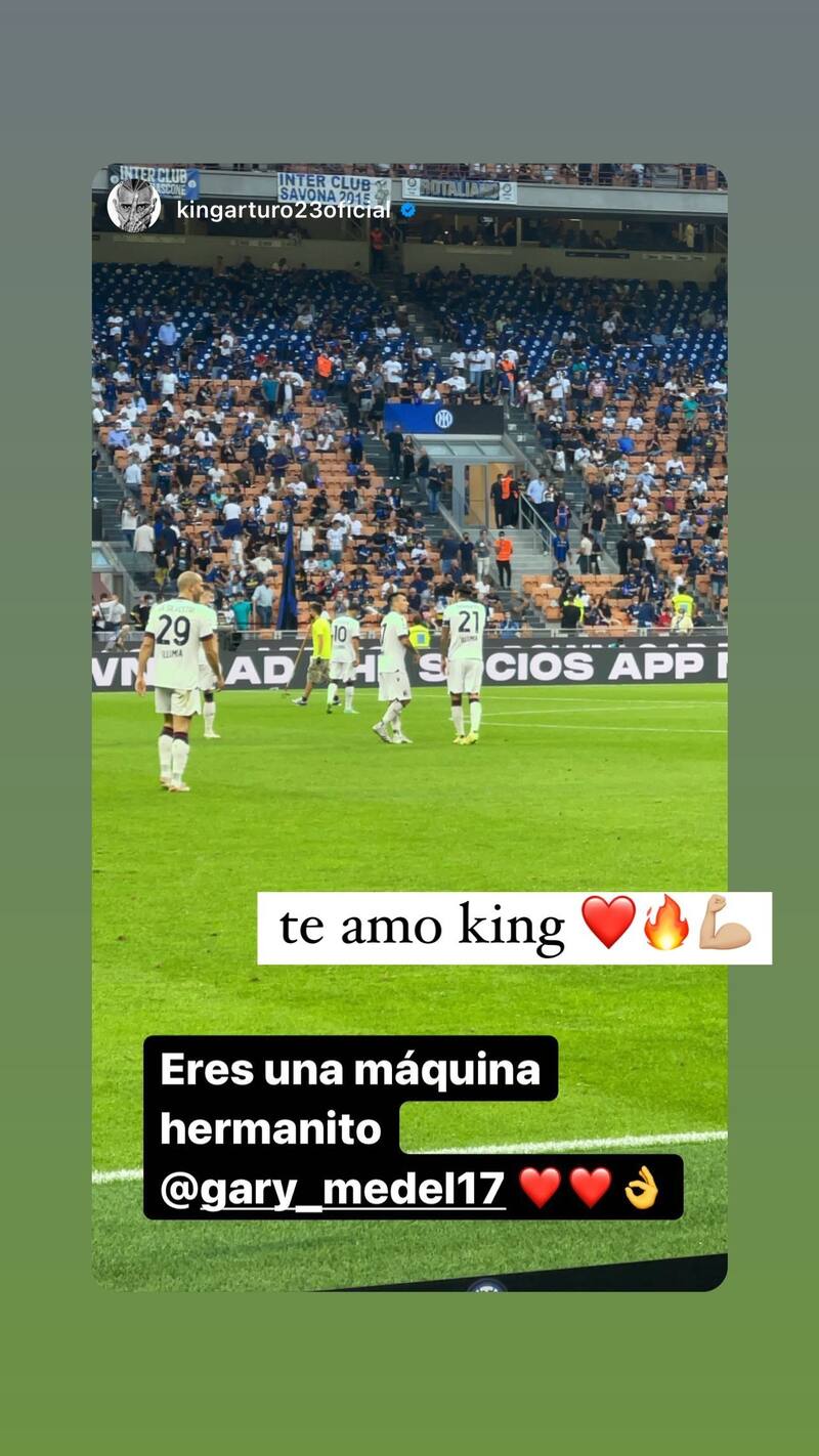 A través de Instagram, el volante de La Roja, Arturo Vidal, posteó una historia destacando a Medel. En la foto, se ve al excruzado en el gramado de juego con sus compañeros, acompañada de la alabanza de Vidal a su compañero de selección. "Eres una máquina, hermanito", señaló el "King", donde también añadió unos emojis de corazones.