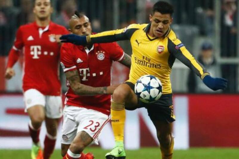 En el partido de ida el Arsenal ganó por 2 goles al equipo alemán, mientras que los bávaros se cobraron revancha con los "Gunners" con una goleada 5 a 1, donde Vidal ingresó en el segundo tiempo y Alexis dio la asistencia a Giroud para el descuento de los londinenses.