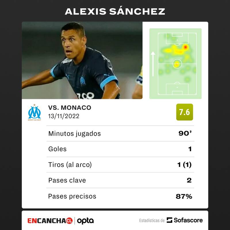 Alexis Sánchez volvió a ser figura en Marsella. El seleccionado chileno anotó un golazo de tiro libre para abrir el marcador ante Mónaco y, además, fue el eje de ataque de su equipo, al generar varias oportunidades de gol. El "Niño Maravilla" cierra la primera rueda con los "Olímpicos" con cinco goles anotados en Ligue 1.