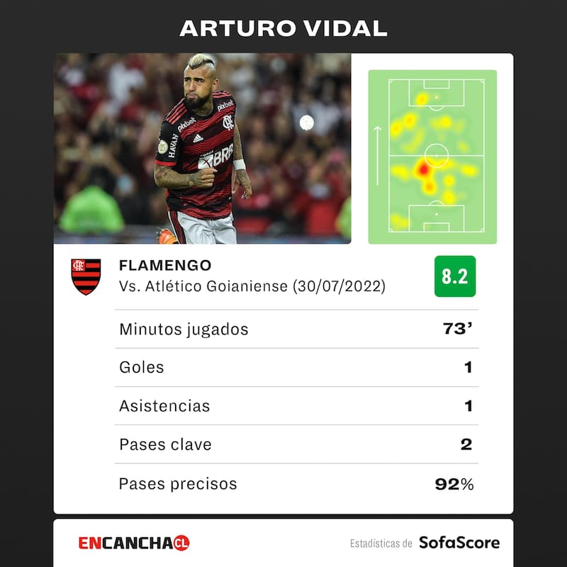 Arturo Vidal no se achicó en su debut como titular en Flamengo y anotó su primer gol en el fútbol brasileño, en el triunfo por 4-1 ante el Atlético Goianiense. El chileno tuvo una destacada actuación y, como es costumbre, aportó en la faceta defensiva y ofensiva.