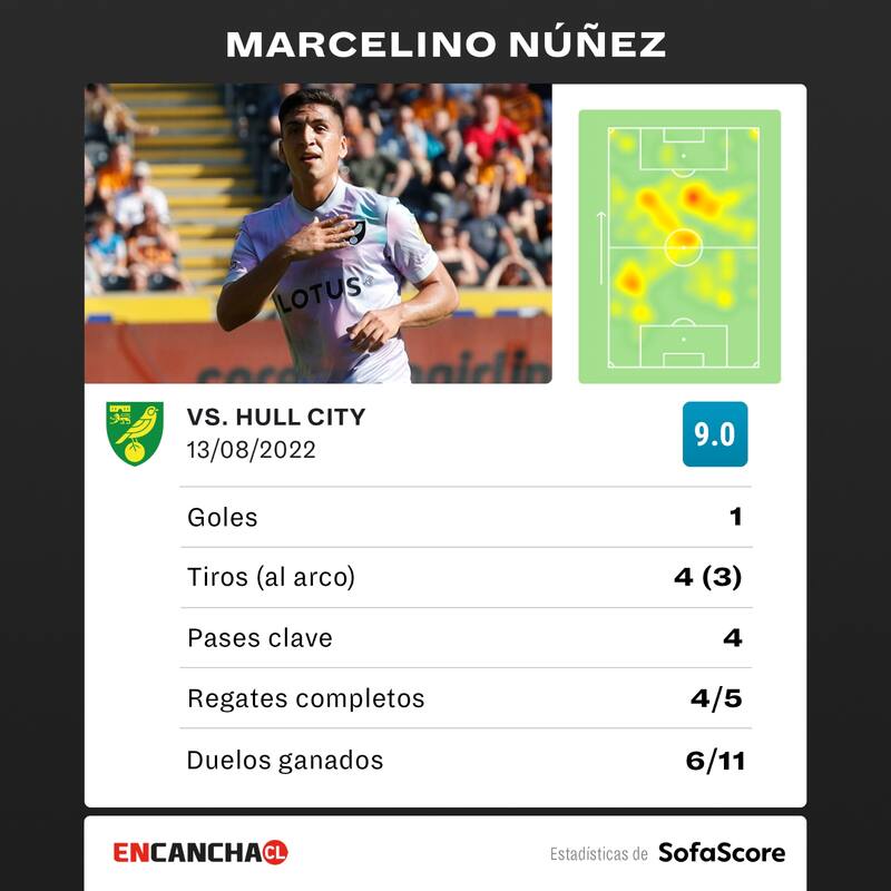 Marcelino Núñez no pudo evitar la derrota de visita 2-1 del Norwich City ante el Hull City por la Championship inglesa. El volante jugó los 90 minutos y marcó el gol que puso el descuento en el partido.