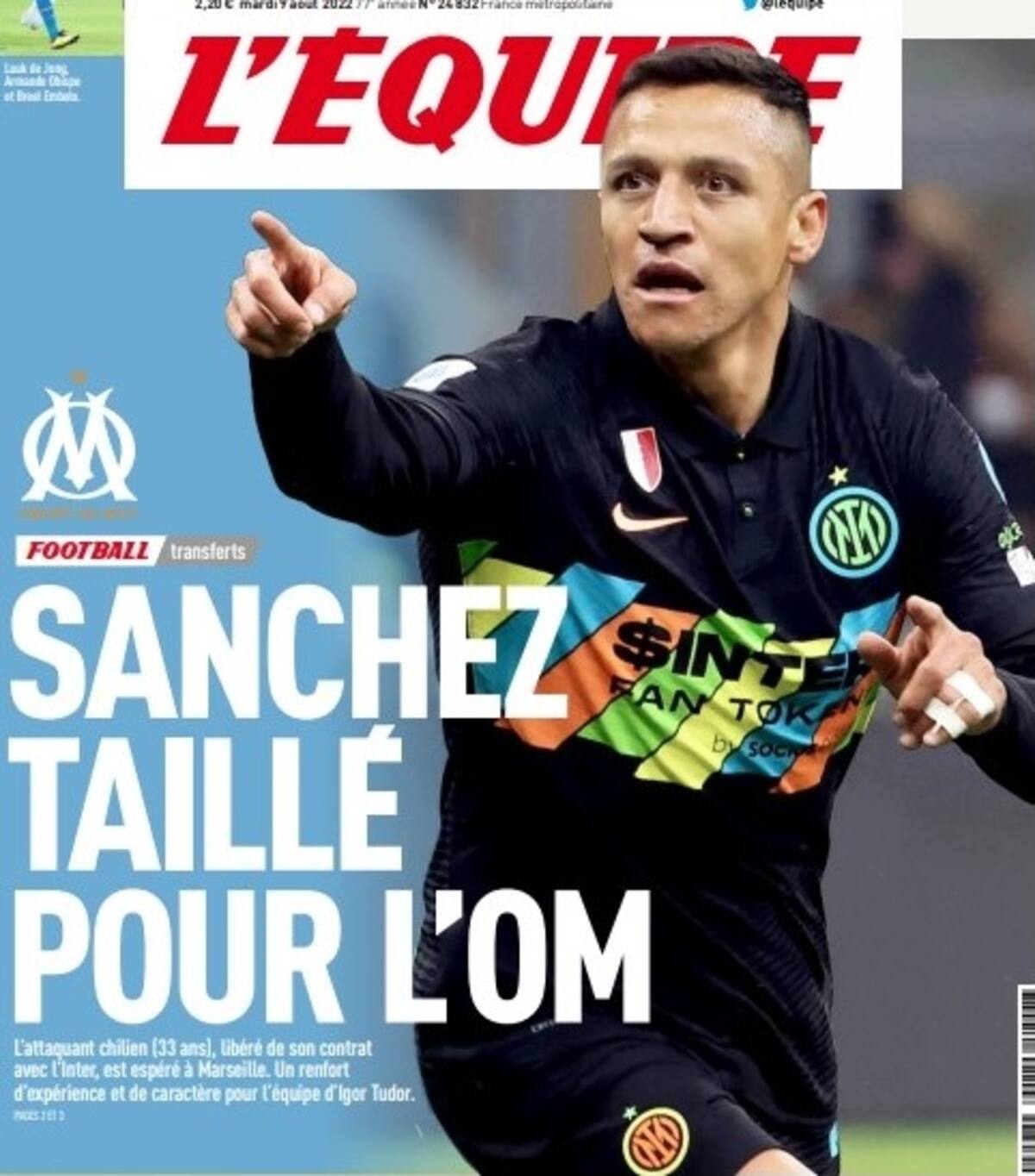 "Sánchez cerca del OM", titula hoy L'Equipe, el principal medio deportivo galo, que le dedica además dos páginas en su edición. "El delantero chileno de 33 años fue liberado de su contrato con el Inter de Milán y sería un refuerzo de carácter para el equipo de Igor Tudor", agregan.