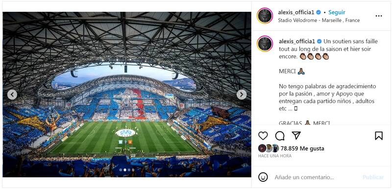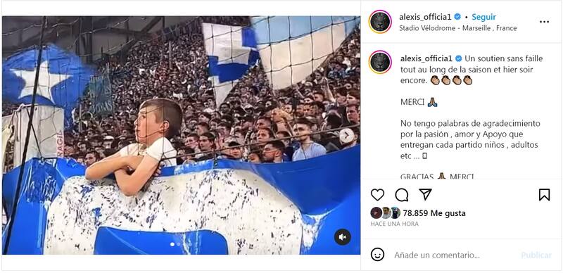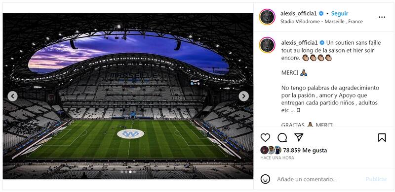“No tengo palabras de agradecimiento por la pasión, amor y Apoyo que entregan cada partido niños, adultos etc. … GRACIAS 🙏🏽 MERCI”, fue lo que comentó Alexis Sánchez en el posteo.