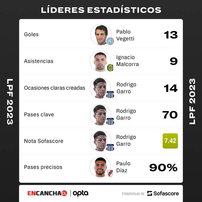 Según detalla el sitio especializado Sofascore, Díaz registró un 90% de precisión en los pases, más que cualquier otro jugador del torneo. En el balance estadístico final de la Liga Profesional destacó también el volante de Talleres de Córdoba Rodrigo Garro, quien lideró en ocasiones claras creadas (14), pases clave (70) y nota en general (7,42).
