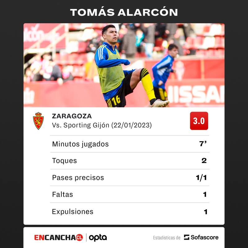 Alarcón ingresó como titular en el duelo contra Sporting de Gijón en Asturias y su actuación fue sencillamente para el olvido: el cuadro sportinguista se puso en ventaja a los 3', con anotación de Dani Queipo, y apenas cuatro minutos más tarde el chileno se fue expulsado del terreno de juego por una violenta entrada sobre el mismo autor del gol.