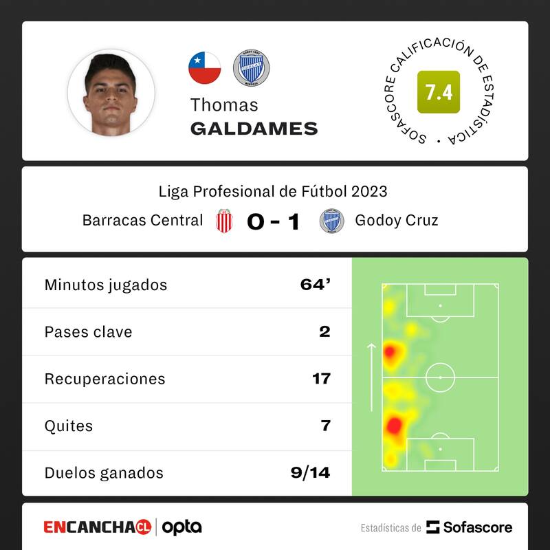 El chileno hizo su debut oficial hoy contra Barracas Central, en la fecha 1 de la Liga Profesional Argentina. Galdames jugó 64 minutos, logrando un correcto desempeño en una posición que, en Chile, se le vio poco, como la fue de lateral volante por la izquierda, encargado del ida y vuelta por esa banda.