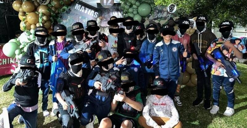 En una de las imágenes publicadas en redes sociales, aparecen los menores invitados a la fiesta con elementos que simulan armas y con vestimentas características de estos carteles, desatando la polémica por el complejo contexto social en México actualmente por el crimen organizado.