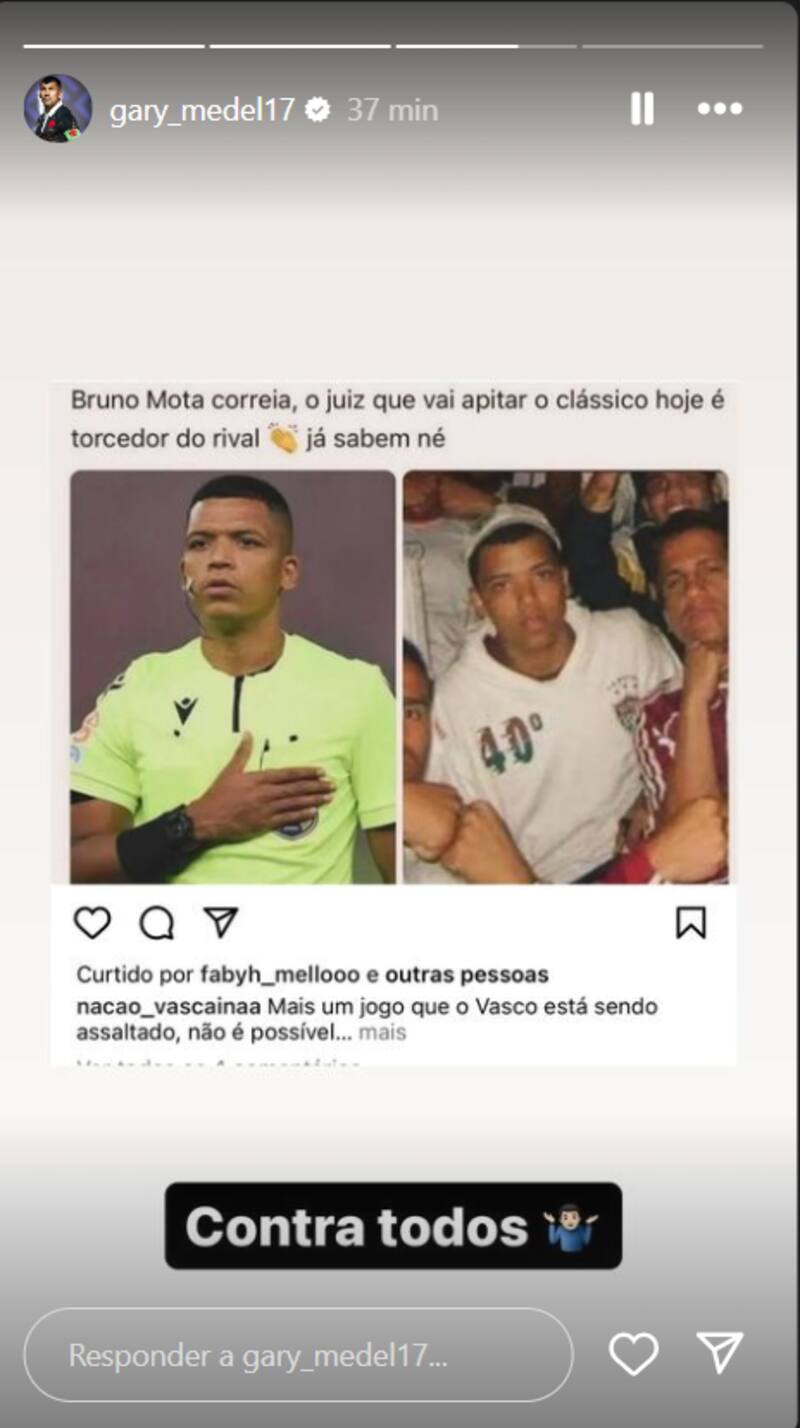 Gary Medel salió ofuscado del clásico. Cómo no, si fue expulsado. Y uno de los principales motivos de la rabia respalda la petición de Vasco para que los jueces vengan de otras partes de Brasil: a Mota Correia se le acusa de ser hincha del Fluminense. Tras el encuentro, algunos jugadores blanquinegros, entre ellos el bicampeón de América, publicaron en redes sociales una fotografía del árbitro con la camiseta del Flu.