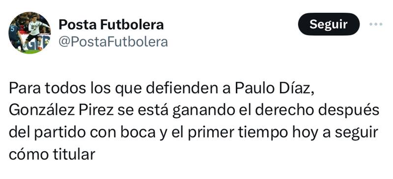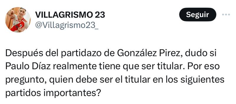 Ante el buen nivel que demostró el canterano Millonario este martes por Copa Libertadores, los hinchas riverplatenses se tomaron las redes sociales para pedirlo como titular por sobre Paulo Díaz en los próximos encuentros de Copa Libertadores.