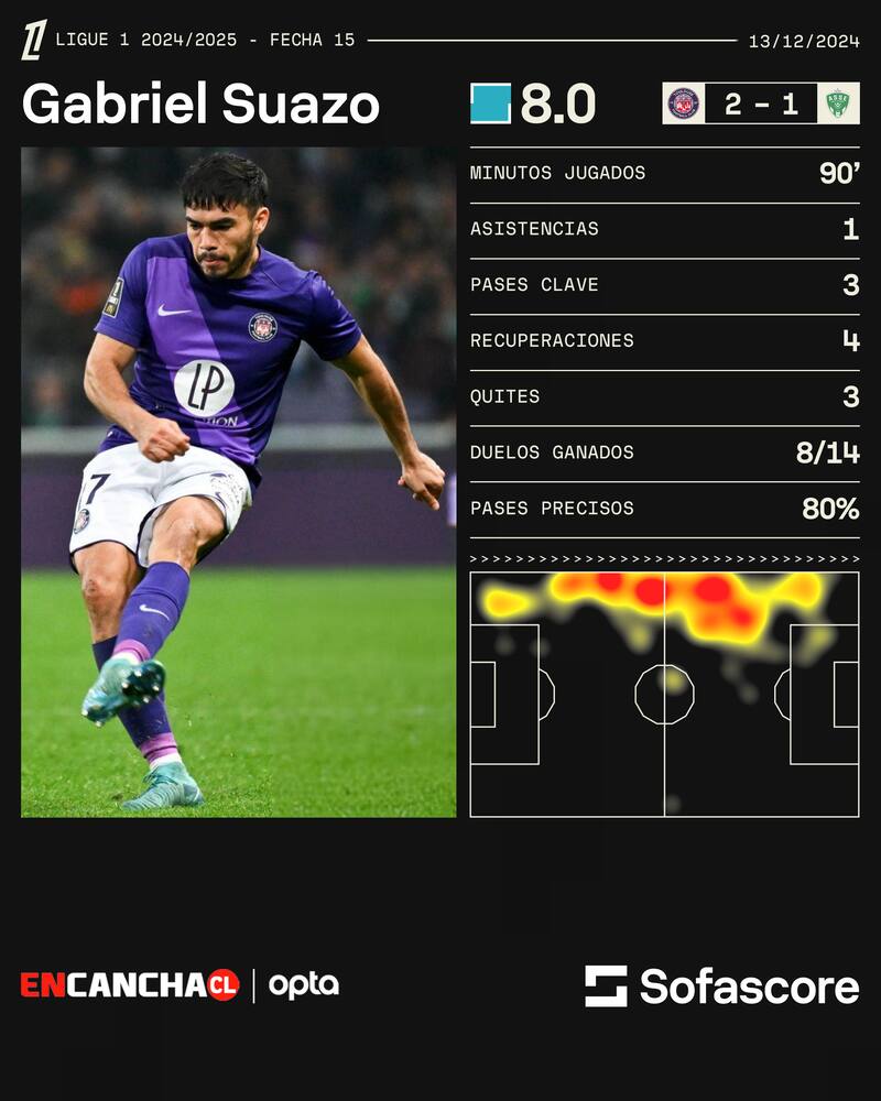 Gabriel Suazo vive un dulce momento en Francia con el Toulouse. El lateral nacional fue una de las figuras en la victoria de ayer (viernes) frente al Saint-Étienne, luego de sumar una nueva asistencia para su registro personal.