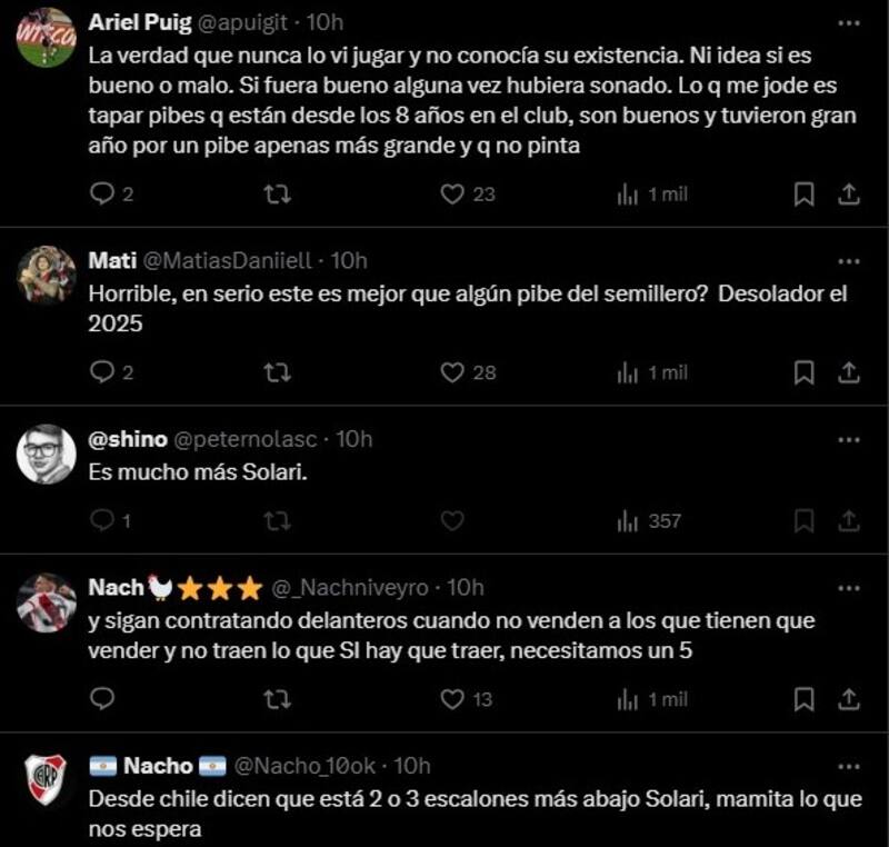 La mayoría de las comparaciones apuntan a Pablo Solari, el último jugador que saltó directamente desde el fútbol chileno a River Plate, y aunque por ahora la expectativa no es mucha con él, no son pocos los que prefieren esperar y ver cómo resulta esta apuesta.