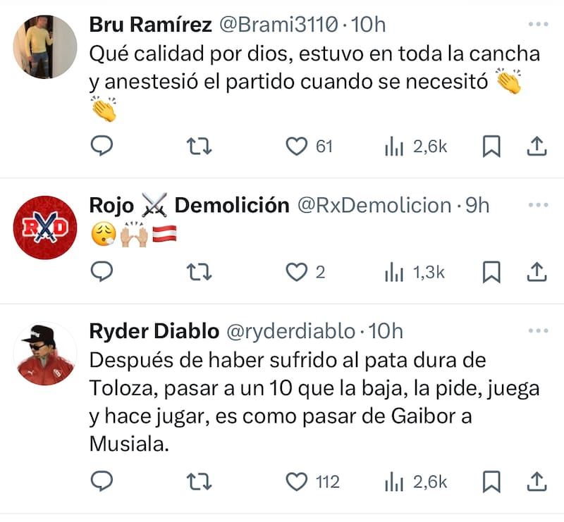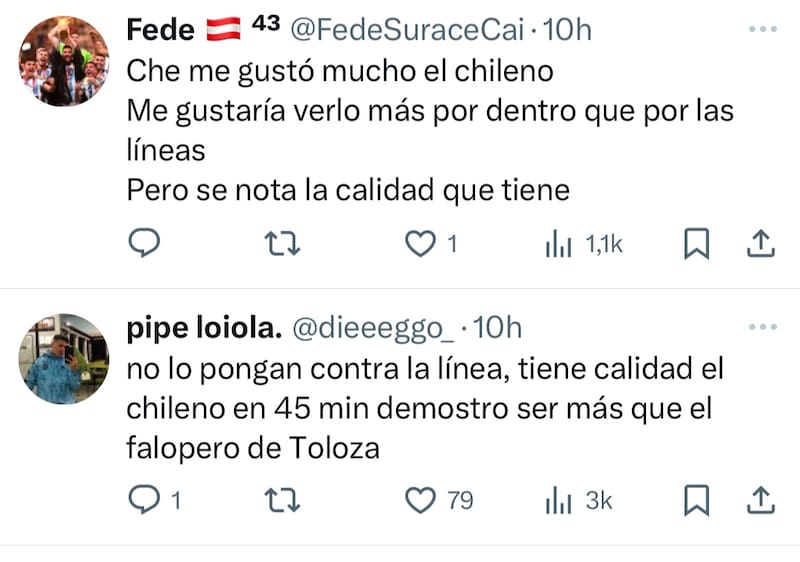 Mientras el ex Coquimbo Unido tuvo que ingresar de emergencia en el primer tiempo por la lesión de Santiago Montiel, el formado en Unión Española jugó los últimos 10 minutos. Y fue Cabral quien se llevó una lluvia de elogios. Al otro lado de la Cordillera valoran el talento de volante creativo clásico que exhibió el seleccionado nacional y todo apunta a que el romance entre jugador e hinchada será largo.