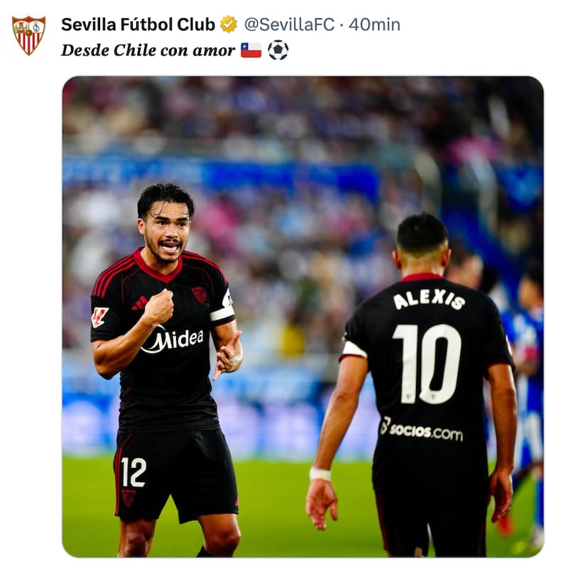 “Desde Chile con amor”, fue el mensaje que publicaron en las redes sevillistas, acompañada de una foto donde aparece Gabriel Suazo y el goleador de la jornada.