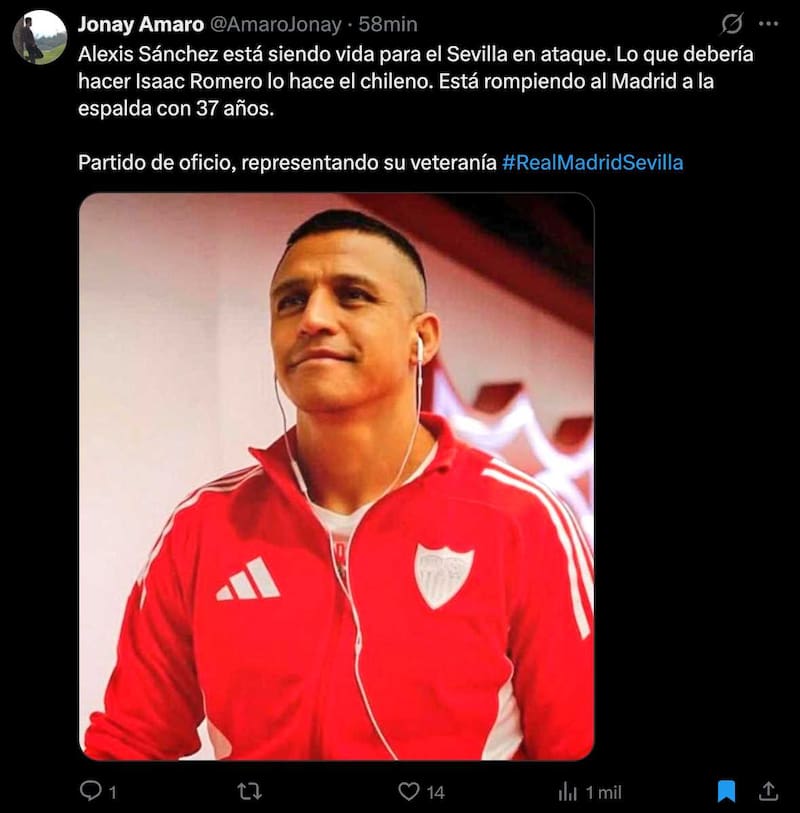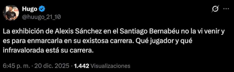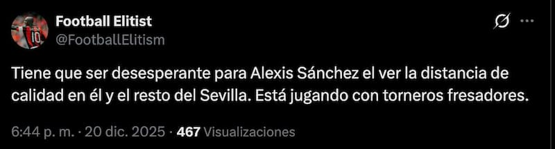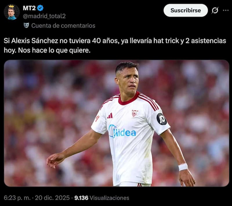 Lee tambiénPese al gran nivel de Alexis Sánchez: Sevilla despide el 2025 con una caída ante Real MadridA Suazo, quien jugó hasta el 60′, también hubo buenas palabras a pesar de la derrota, donde le colocaron nota 6 y evaluaron que tuvo “una hora de partido bastante buena para el chileno tras salir de su lesión. Estuvo en la buena línea del Sevilla en el Bernabéu mientras estuvo en el campo”.