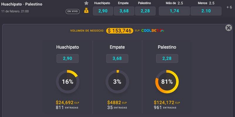 Coolbet ya tiene su pronóstico para este compromiso. Si es que gana Huachipato entregará una cuota de 2.90, mientras que la victoria de Palestino, pagará 2.28. Por su parte, una igualdad dará 3.68.