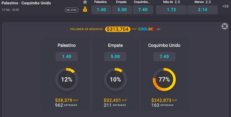 Coolbet ya tiene su pronóstico para este compromiso. Si es que gana Palestino entregará una cuota de 1.40, mientras que la victoria de Coquimbo Unido, pagará 7.40. Por su parte, una igualdad dará 5.00.
