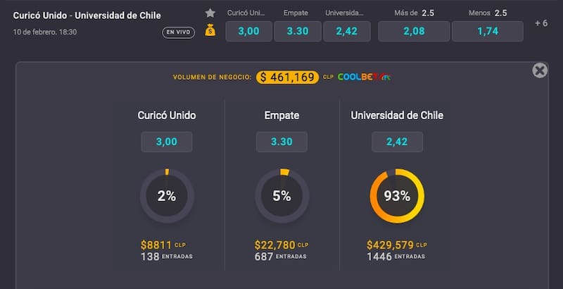 Coolbet ya tiene su pronóstico para este compromiso. Si es que gana Curicó Unido entregará una cuota de 3.00, mientras que la victoria de U. de Chile, pagará 2.42. Por su parte, una igualdad dará 3.30.