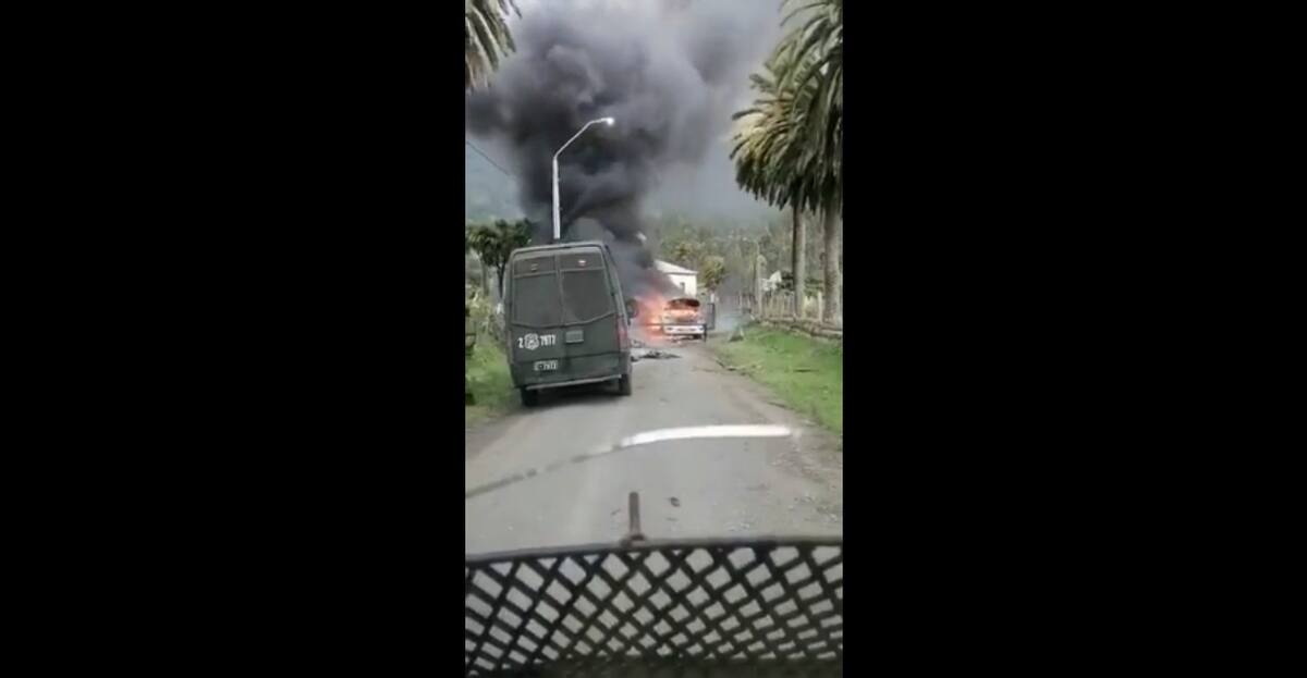 En horas de esta jornada un registro audiovisual registró la quema de dos vehículos en medio de un camino de tierra en Contulmo, Región del Bío-Bío. Más tarde, se supo que aquellos vehículos pertenecían al OS9 de Carabineros que se encontraba realizando una investigación, específicamente, en el poblado de Elicura.