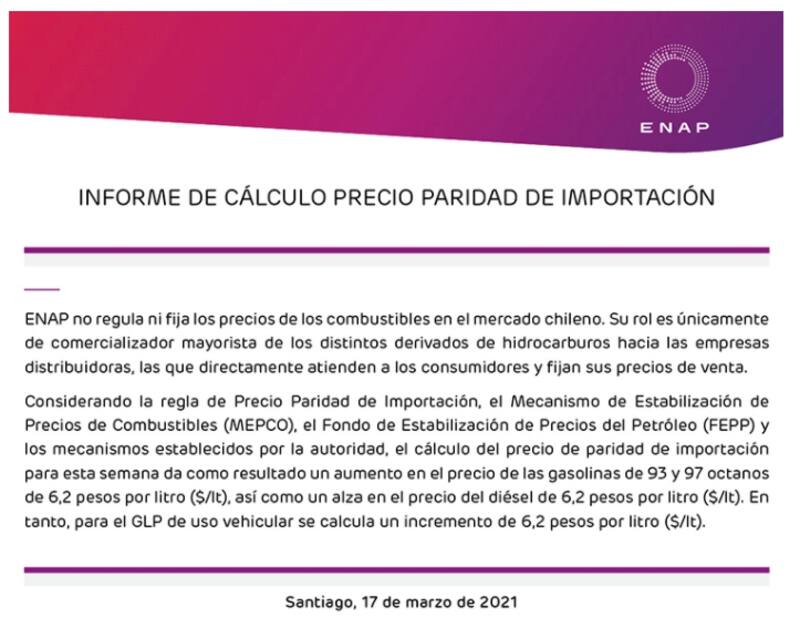 Según indicaron desde la estatal, para establecer la proyección, Enap se apoyó tanto en la regla de precio paridad de importación, el Mecanismo de Estabilización de Precios de Combustibles (Mepco), el Fondo de Estabilización de Precios del Petróleo (FEEP), y los mecanismos establecidos por la autoridad.