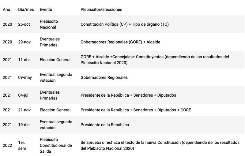 En cuanto a los constituyentes, el experto en ciencias políticas indicó que "el plazo para redactar la nueva constitución es el mismo que está establecido, es decir, nueve meses, prorrogable por otros tres meses, es decir un año, pero esta extensión de las elecciones, significa un aplazamiento del plebiscito de salida. Por lo tanto, lo más probable es que el plebiscito de salida, a fines del primer semestre del año 2022, puede que sea el segundo semestre del próximo año".