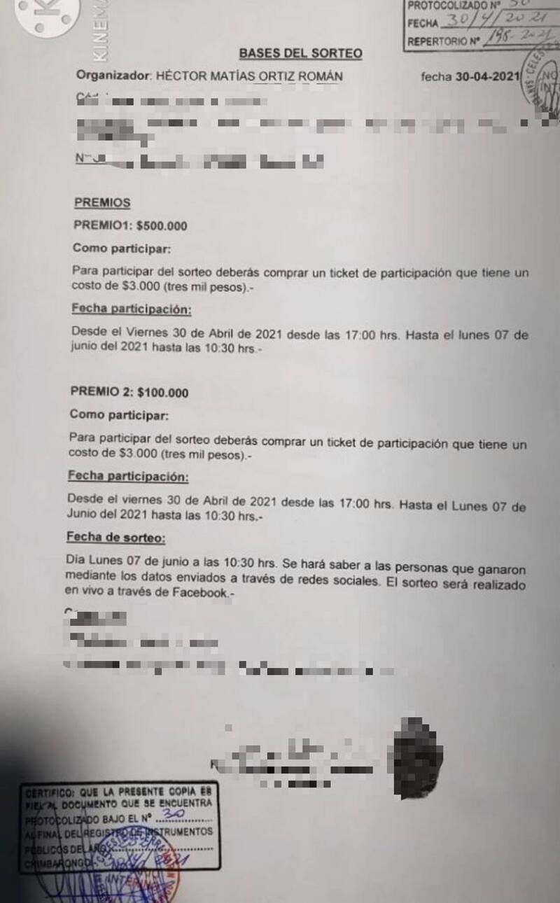 Héctor Matías Ortíz Román subió un video a sus redes sociales en el que anunció el sorteo, así como también dio a conocer el documento con las bases legales que tramitó ante notario interino de San Fernando con asiento en Chimbarongo, Celeste Nicol Becerra Marín.