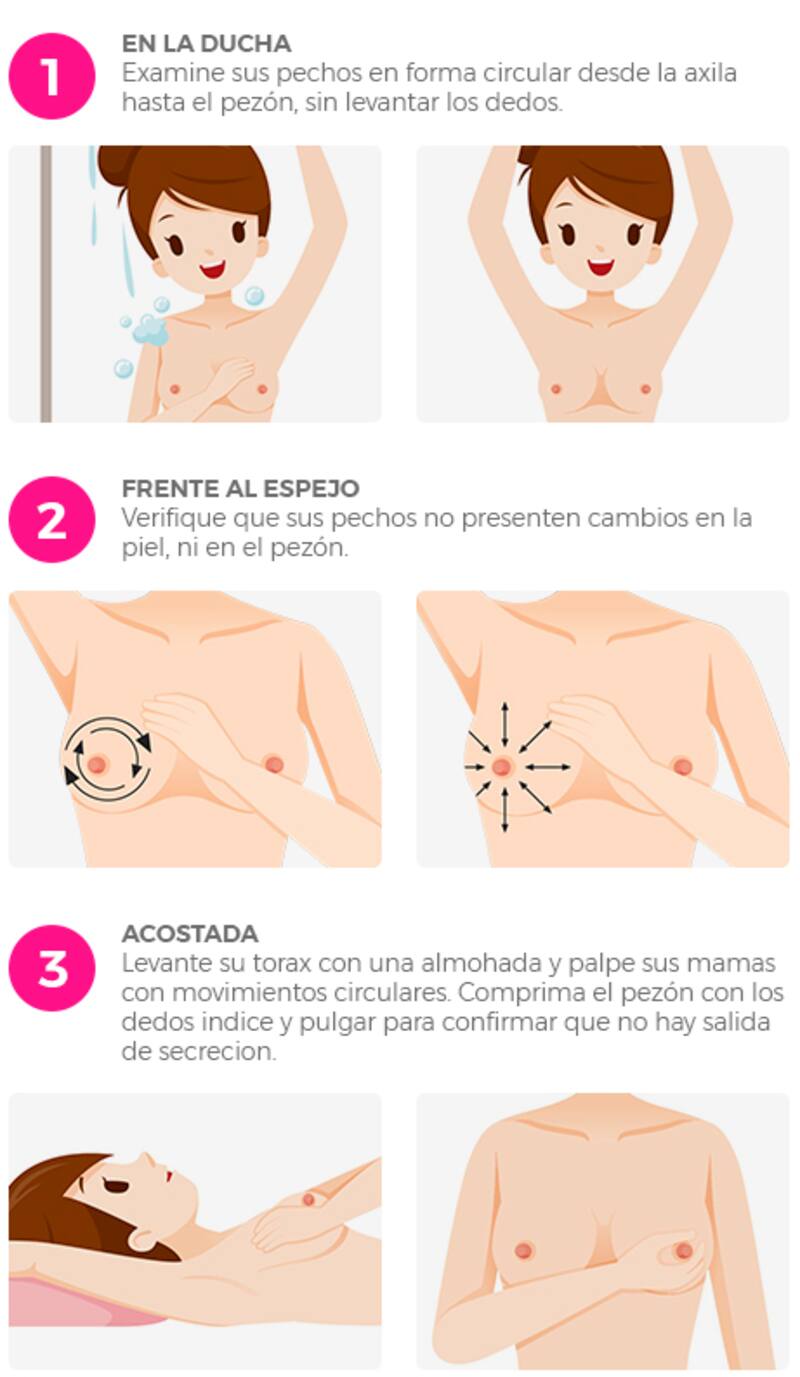 Examínalos mientras en tu cama acostándote de espaldas y con una almohada en el cuello. Palpa tus mamas con movimientos circulares y luego aprieta el pezón con tus dedos para verificar que no existe alguna secreción.
