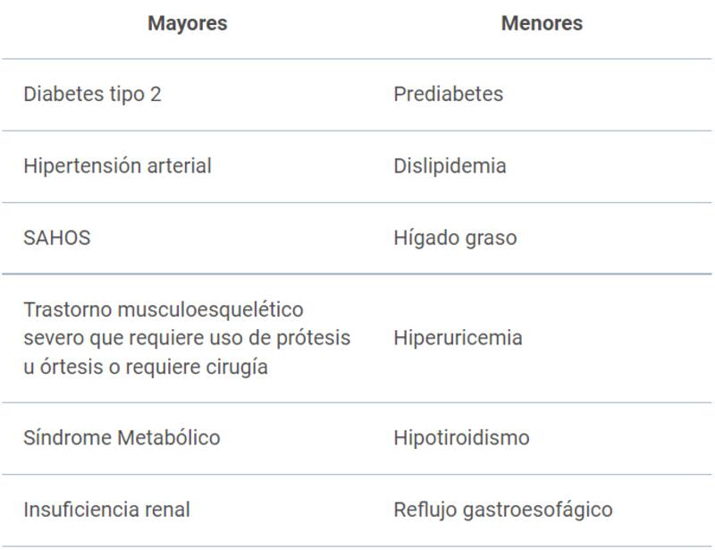 Padecer co-morbilidades relevantes (al menos 1): diabetes tipo 2, síndrome apnea obstructiva del sueño u osteoartritis de grandes articulaciones.