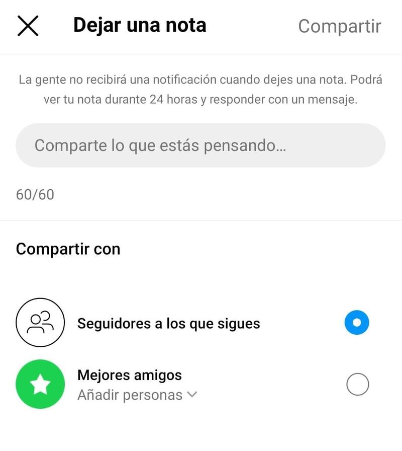 Las "Notas" de Instagram son un texto personalizado de máximo 60 caracteres (incluyendo los espacios).