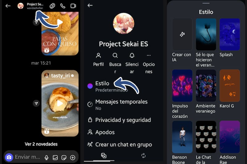 Para activar esta personalización, primero deberás dirigirte a la conversación a modificar y pulsar en la parte de arriba, el nombre del usuario. Luego, presionar “Estilo” y elegir alguno.