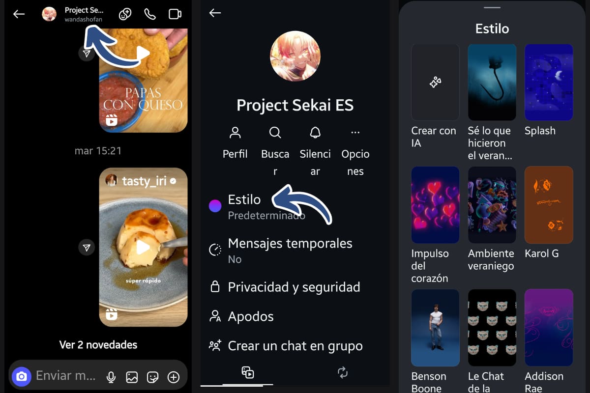 Para activar esta personalización, primero deberás dirigirte a la conversación a modificar y pulsar en la parte de arriba, el nombre del usuario. Luego, presionar “Estilo” y elegir alguno.