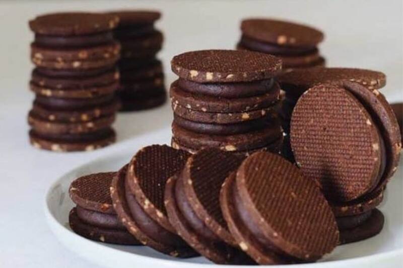 Una vez relleno, baña cada alfajor sumergiéndolo en el chocolate derretido.