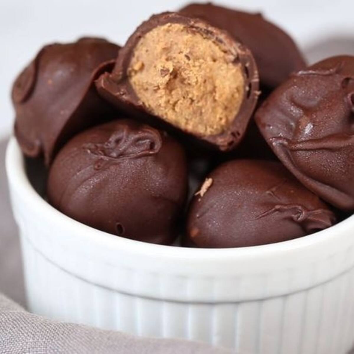 Derretir el chocolate con leche de la misma forma que el chocolate blanco, y con la ayuda de dos tenedores bañar las bolitas de mantequilla de maní ahí. Poner los bombones bañados en la bandeja con papel mantequilla y llevar al refrigerador por al menos 10 minutos antes de servir.