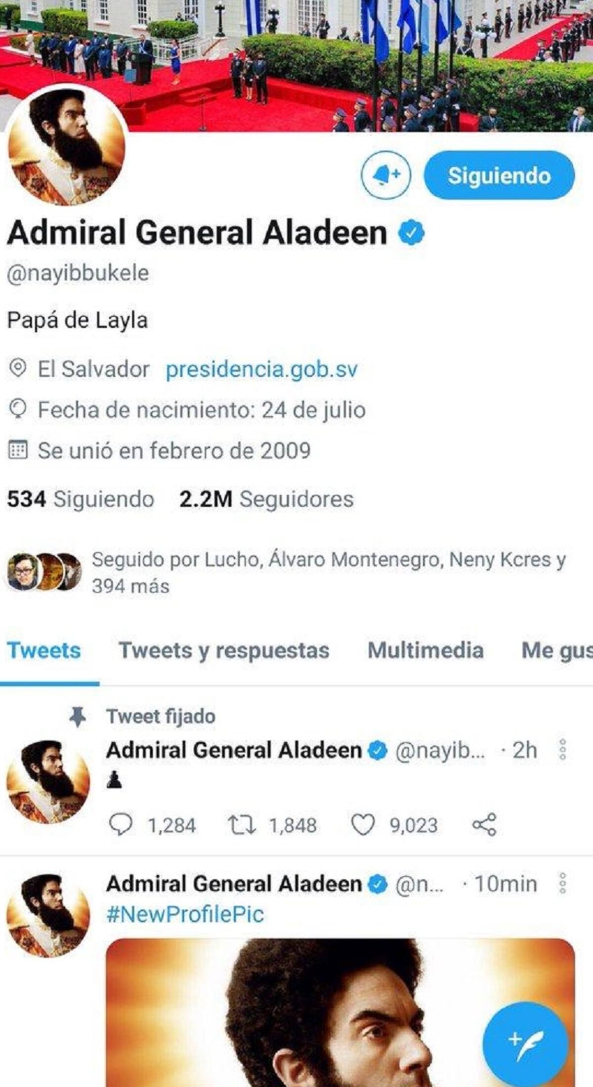 El presidente de El Salvador, Nayib Bukele, ocasionó enorme polémica al cambiar su foto de perfil por la del protagonista de la película «El Dictador». Bukele además colocó, en lugar de su nombre, el de Admiral General Aladeen, correspondiente al nombre del intérprete de dicha imagen.