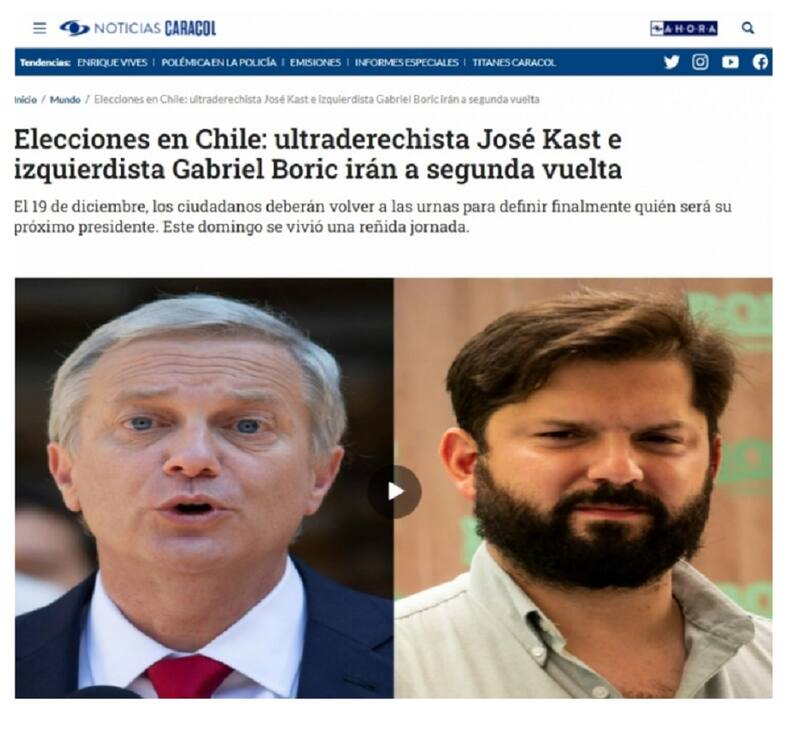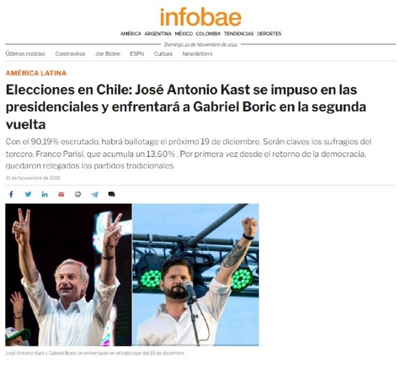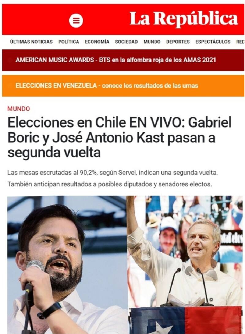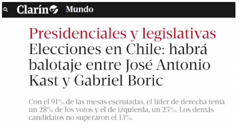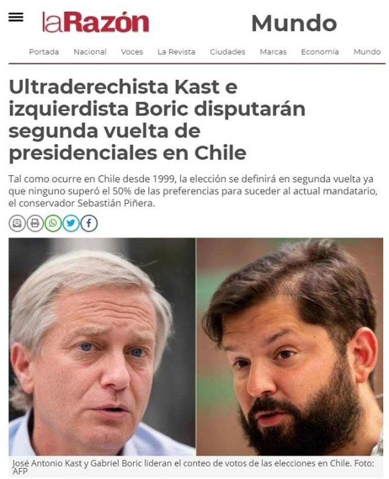 "Ultraderechista Kast e izquierdista Boric disputarán segunda vuelta de presidenciales en Chile", señala el medio La Razón, situando a cada candidato en su sector.