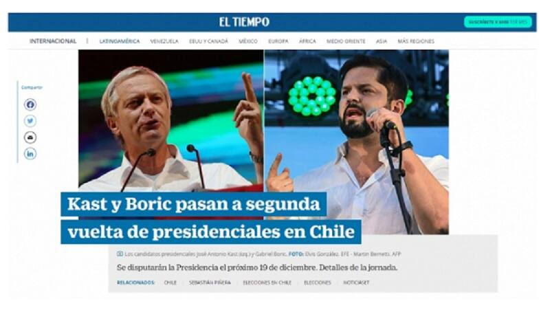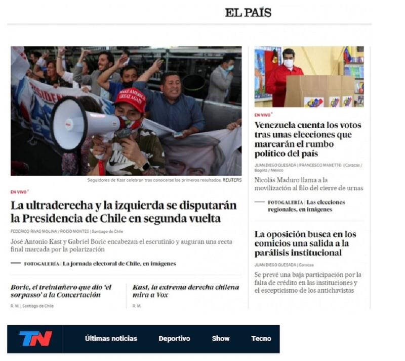 "La ultraderecha y la izquierda se disputarán la Presidencia de Chile en la segunda vuelta", señala el medio El País, de España. En su portada, se pueden ver otros dos titulares, que también perfilan a ambos candidatos. En el caso del candidato del Partido Republicano, José Antonio Kast, dicen: "Kast, la extrema derecha chilena mira a Vox".