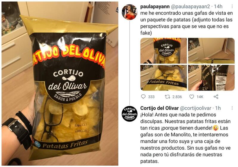 "¡Hola! Antes que nada te pedimos disculpas. Nuestras patatas fritas están tan ricas ¡porque tienen duende! Las gafas son de Manolito, te intentaremos mandar una foto suya y una caja de nuestros productos. Sin sus gafas no ve nada pero tú disfrutarás de nuestras patatas", explicaron.