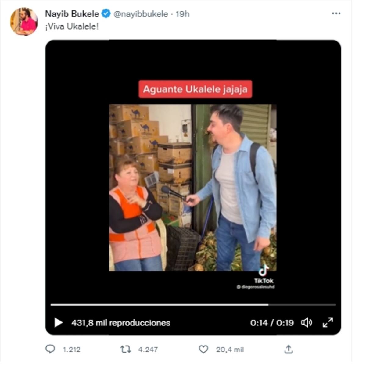 Luego de ser advertida por el entrevistador, la locataria corrigió y señaló que se refería a Nayib Bukele. El video llegó hasta las manos del Mandatario salvadoreño y publicó el registro en su cuenta de Twitter, con el mensaje "¡Viva Ukalele!".