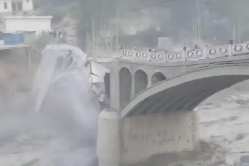 En un registro se puede ver el puente de Hassanabad que está ubicado en la autopista Karakoram (KKH), que une el norte de Pakistán con el oeste de China, mientras se hunde bajo la fuerza de la corriente.