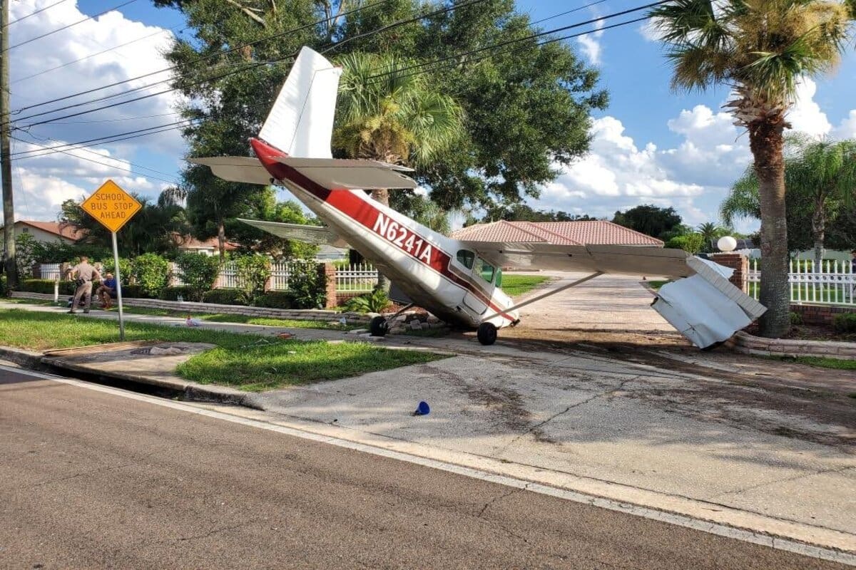 Se trata de una avioneta Cessna 182 que, según un comunicado de la Patrulla de Carreteras de Florida, sus alas golpearon dos palmeras. El choque causó daños menores en la pared de la entrada de una casa.